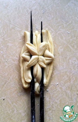В нижнем положении чуть разведите палочки в разные стороны (вправо и влево), чтобы середина чуть опустилась. Иначе при выпечке середина в верхней части раздвинется.