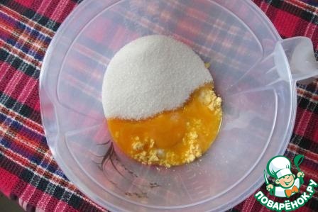 В миску положить вареный желток и желтки сырых яиц, всыпать сахар.