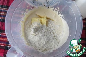 Добавить к желтково-сахарной массе мягкое сливочное масло и 3 столовых ложки муки.