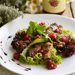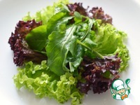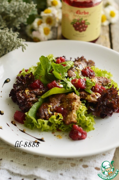 Описание: Очень люблю такие салаты. Много зелени, теплая печень и особую нотку дают кубики брусничного желе.