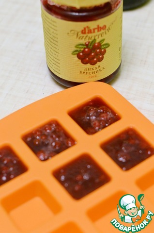 2. Брусничный соус смешать с водой, довести до кипения, снять с огня. Желатин отжать, добавить в соус и дать ему полностью растворится. Вылить смесь в силиконовую форму, убрать в холодильник до полного застывания. |
