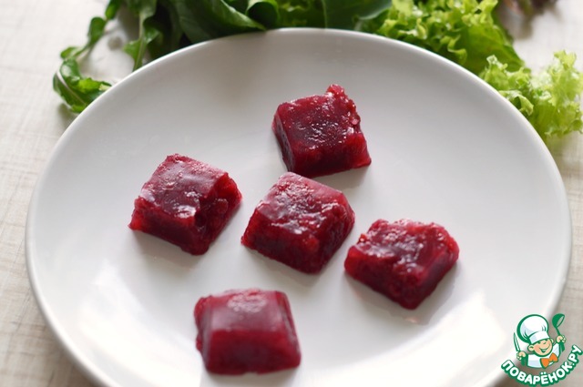 3. Листья салата вымыть, обсушить. Кубики желе вынуть из форм. Я эти кубики разрезала на 4 части. |