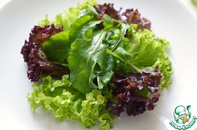 4. На тарелку выложить салатные листья. Печень посолить, поперчить, панировать в муке. В сковороде разогреть масло, обжарить печень с двух сторон до золотистой корочки. |