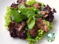 Очень люблю такие салаты. Много зелени, теплая печень и особую нотку дают кубики брусничного желе.