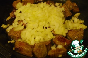 2. В кастрюле с толстым дном разогреть масло и обжарить мясо до золотистого цвета. Лук нарезать кубиком добавить к мясу, обжаривать 3 минуты.