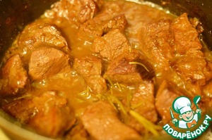 5. В форму выложить мясо, я выложила в порционные формы, сверху полить соусом, в котором тушилось мясо.