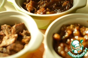 4. Затем к мясу добавить орехи, сливовый соус и готовить еще 10 минут. Затем мясо остудить, с помощью вилки разобрать на небольшие кусочки.
