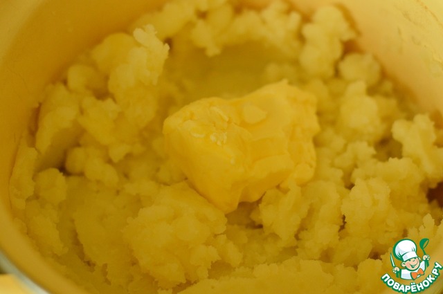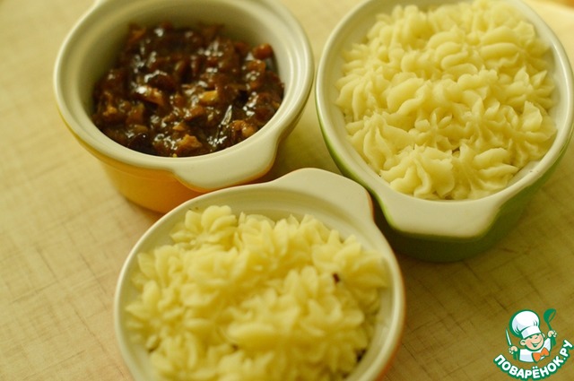 • 6. Затем выложить картофельное пюре, я отсадила с помощью насадки.