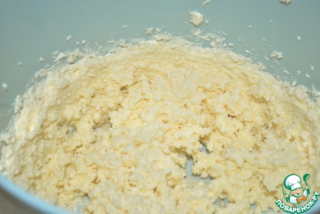 11) Порезать на кусочки 180г. охлажденного маргарина, соединить с сухой массой. Перемешать до состояния хлебных крошек. Можно добавить 2 ст. л. рома или коньяка.
