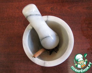 • Перемолоть специи все кроме, одной палочки корицы и звездочки бадьяна. Очень удобно ступкой пользоваться для этой цели.