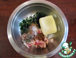 • В большой миске смешать сало, укроп, петрушку, помолотые специи и размягченное сливочное масло.