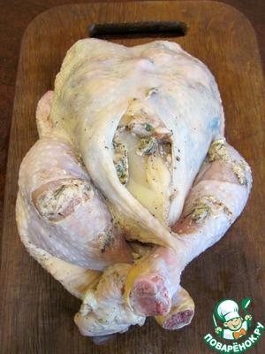 • Помыть и высушить курицу. Сделать по два надреза, до кости, в голени.