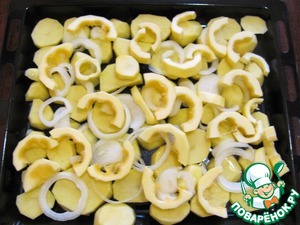 • Овощи нарезать крупными кусочками, лук - полукольцами и выложить на противень, смазанный растительным маслом. Немного посолить.