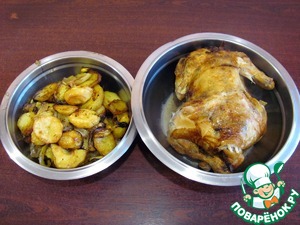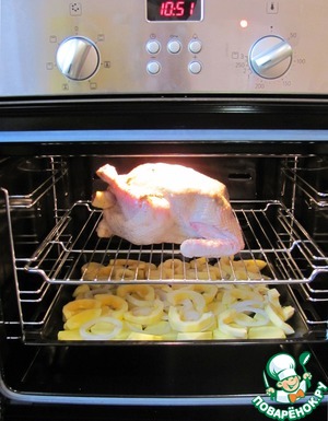 • Все это в духовку, картошку на противне вниз, курицу на решетке сверху.