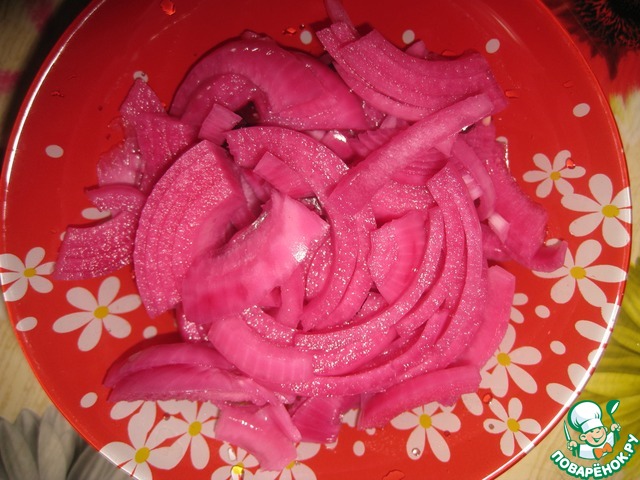 Когда искала рецепт маринада для лука, наткнулась на одном из кулинарных сайтов именно на этот. Теперь всегда его использую! Лук можно и так лопать :), не добавляя его в салаты :) Получается ну оочень вкусный и хрустящий.