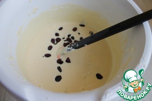 Для заливки смешаем творог, у меня пастообразный, с сахаром, ванильным пудингом, и сметаной. По одному добавим яйца не переставая взбивать. В конце добавляем изюм. Или как у меня вишня вяленая.