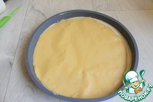 Тесто достаем из холодильника и раскатываем круг по диметру нашей формы. Для этого я взяла вырезала бумагу по кругу нашей формы. И на ней раскатала через пленку тесто. Оно не очень хорошо раскатывается на столе. И затем я удалила лишнее тесто. И переложила его на творог. Затем убрала бумагу
