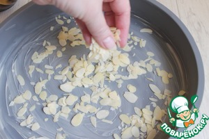 Теперь берем форму. У меня силиконовая 26см. Смажем ее маслом. И посыпем миндальными лепестками.