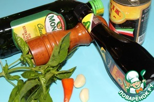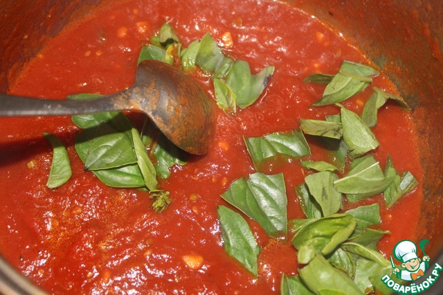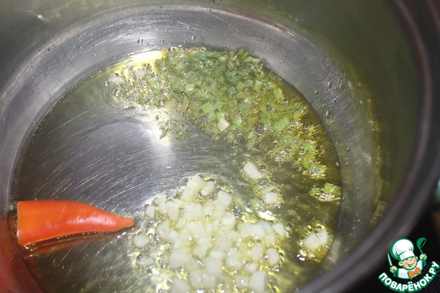Затем наливаем в кастрюлю с толстым дном оливковое масло, нагреваем и слегка обжариваем измельченный чеснок, стебель базилика и перчик чили.