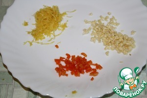 Снимем цедру с половинки лимона, измельчим перчик чили и зубки чеснока.