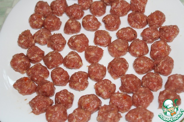 Скатаем фрикадельки размером с крупный фундук. Руки время от времени смачиваем холодной водой, чтобы фрикадельки получились более плотными и держали форму. Укладываем на поднос (блюдо) и отправляем в холодильник на время приготовления соуса.