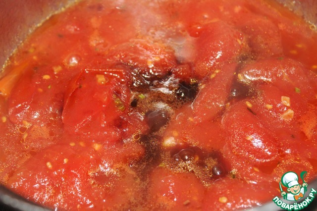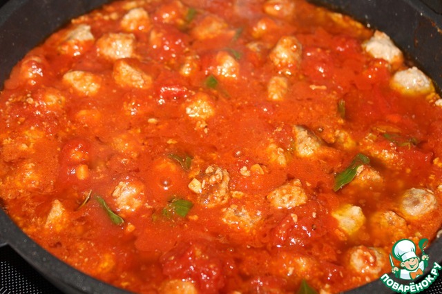После этого, аккуратно выльем на фрикадельки томатный соус, предварительно удалив перчик чили. Закроем крышкой и дадим потушиться 10 - 15 минут.