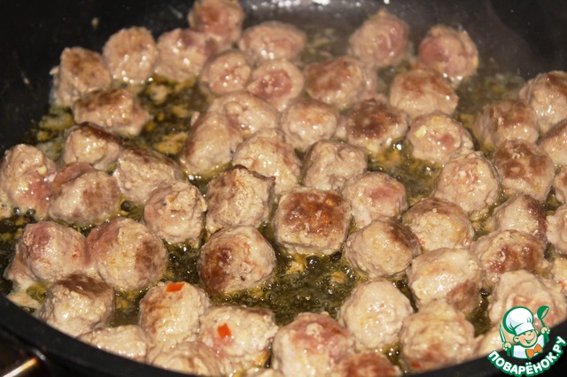 В сковороде разогреваем немного оливкового масла (количество масла в ингредиентах я указала приблизительно), положим в него фрикадельки и подрумяним их со всех сторон.