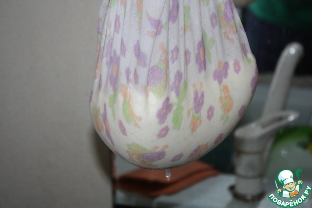 Выстелите дуршлаг марлей. Поместите сырную массу в дуршлаг, слейте сыворотку. Сыворотку не выливайте, она Вам пригодится, например, для выпечки.