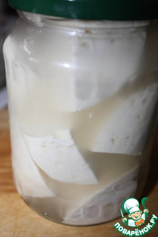 Сыр нарежьте на куски 3-5 см и уложите в банку. Залейте рассолом.