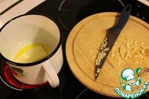 Сливочное масло кладем в посуду, растапливаем на среднем огне. Чеснок мелко рубим или пропускаем через пресс, добавляем к маслу, немного обжариваем.