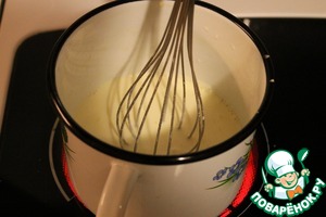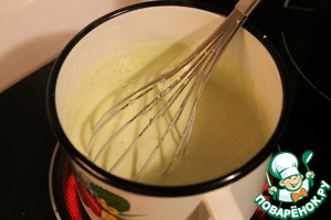 Добавляем муку, перемешиваем до однородного состояния. Выливаем сливки, хорошенько нагреваем, но не кипятим ни в коем случае.