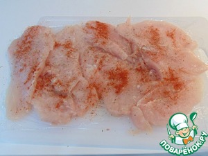 Куриное филе помыть, обсушить бумажными полотенцами, накрыть пищевой пленкой и отбить. Посолить, поперчить паприкой и щепоткой прованских трав.