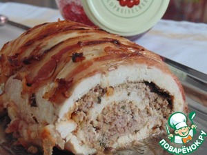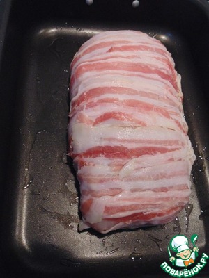 Обернуть полосками бекона, выложить рулет в форму, смазанную оливковым маслом, накрыть форму фольгой. Поставить в заранее разогретую духовку до 190 гр С на 40 минут.