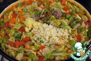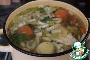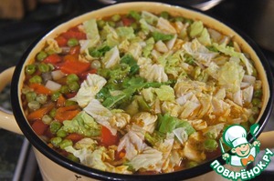 • В последнюю очередь заложить капусту и имбирь, довести до кипения, огонь убавить до минимума и потомить суп 2 минуты.
