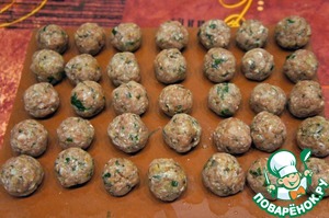 • Фарш (можно взять и говяжий, и смешанный; у меня была телятина и немного филе куриной грудки) выложить в миску, добавить очень мелко нарезанную и обжаренную до золотистого цвета луковицу, специи, приправу и зелень, перемешать. Если фарш слишком густой, влить ложку-другую воды. Фарш вымесить и затем хорошо отбить. Я решила в этот раз обойтись без хлеба и без яйца. Скатать небольшие шарики, выложить их на доску и вынести на холод, чтобы окрепли.