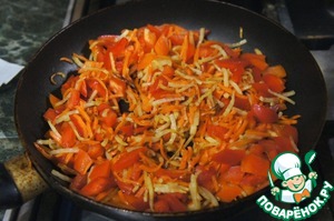 • Морковь и сельдерей спассеровать на растительном масле до полуготовности, добавить перец и обжарить в течение 5 минут. Добавить томат-пасту и тушить еще несколько минут.