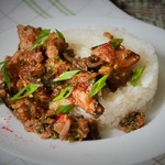 Подаем мясо горячим с теплым рисом. К рису я подаю соус в соуснике из соевого соуса смешанным с рисовым уксусом по вкусу. Можно посыпать блюдо порезанным зеленым луком.