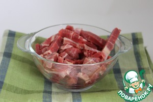 Пока варится рис готовлю мясо: говядину режу поперек волокон тонкими полосками