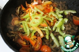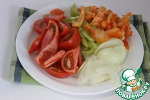 Помидоры, лук репчатый, перец болгарский режу полосками, чеснок мелко порублю
