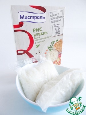 Для приготовления этого блюда я использую рис "Кубань" белый круглозерный компании "Мистраль" в пакетиках. Опускаю пакетики с рисом в кипящую воду и варю на медленном огне 25 минут.