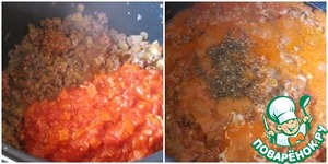 Соединить обжаренный фарш с баклажанами с томатным соусом, добавить томатную пасту, сметану, специи и пряные травы.