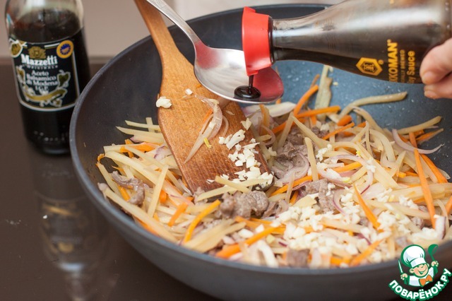 И следом - красный молотый перец, чеснок, уксус, сахар, кунжут и соевый соус. Все это должно обжариваться после мяса еще 10 секунд. Итого наш салат должен готовиться всего 30 секунд! Овощи остаются хрустящими, но не сырыми, ведь картошка у нас прошла дополнительную тепловую обработку в кипятке, а остальные продукты в обработке не нуждаются. Мясо же за счет тонкой нарезки успевает приготовиться за 30 секунд, но если такая краткая обработка вас смущает, можете увеличить время до 1-2 минут. В любом случае, прежде чем снимать вок с огня, попробуйте продукты на готовность, поскольку ваша нарезка может отличаться от моей и картошка может быть сыровата