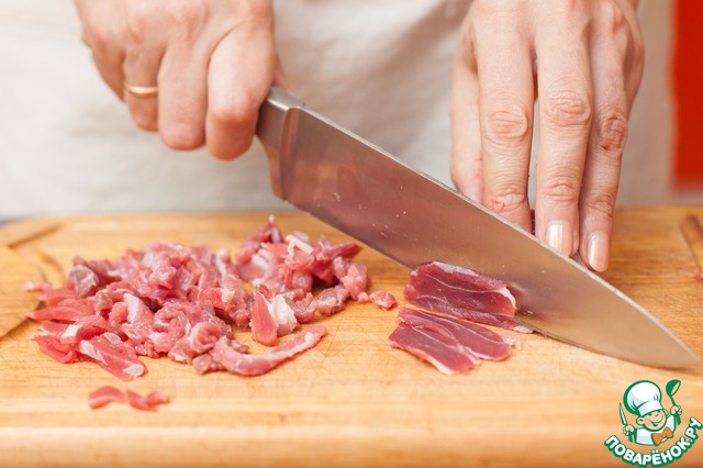 Мясо нарезаем тонко брусочками или пластинами. Чтобы это можно было сделать легко, мясо надо слегка подморозить в морозильной камере примерно полчаса-час (зависит от мощности вашего холодильника)