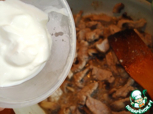 На раскаленную сковороду с растительным маслом выложим свинину и грибы, огонь максимальный. Готовим 4 минуты, помешивая.
