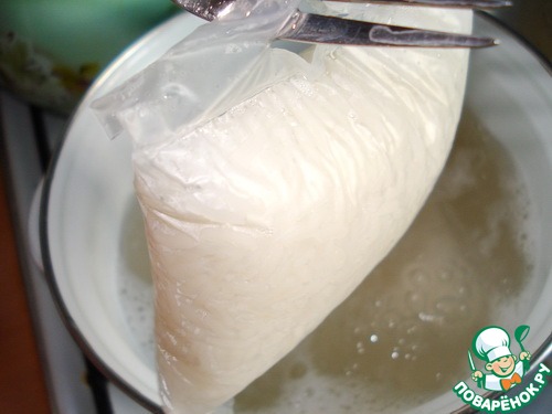 А вот и рис сварился. Достаем пакетик и даем стечь воде. Аккуратно вскроем пакетик сбоку и выложим рис на тарелку.