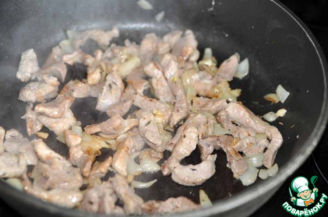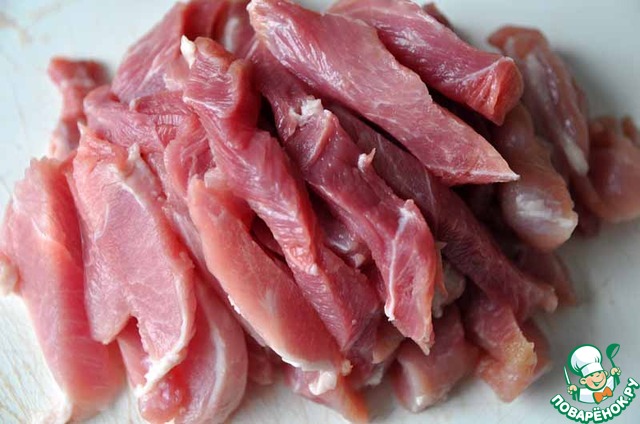 Берём мясо: нежирную свинину или телятину и режем поперёк волокон полосками.