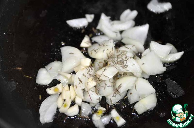Разогреваем сковороду, наливаем оливковое масло, кладём лук, чеснок и тимьян (можно веточку свежего, у меня сушёный). Обжариваем одну минуту.