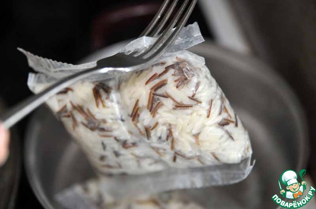 Готовый рис в пакетике достаём вилкой, даём стечь воде.