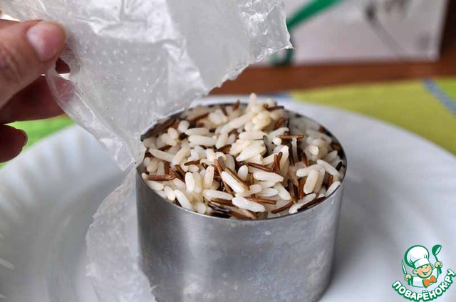 В пакетике отрываем краешек, кладём рис на блюдо. Я использовала сервировочное кольцо.