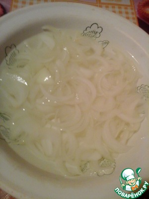 3 слой: репчатый лук нарезать полукольцами, ошпарить кипятком, 15 минут выдержать в уксусе, отжать. Майонезом не смазывать.